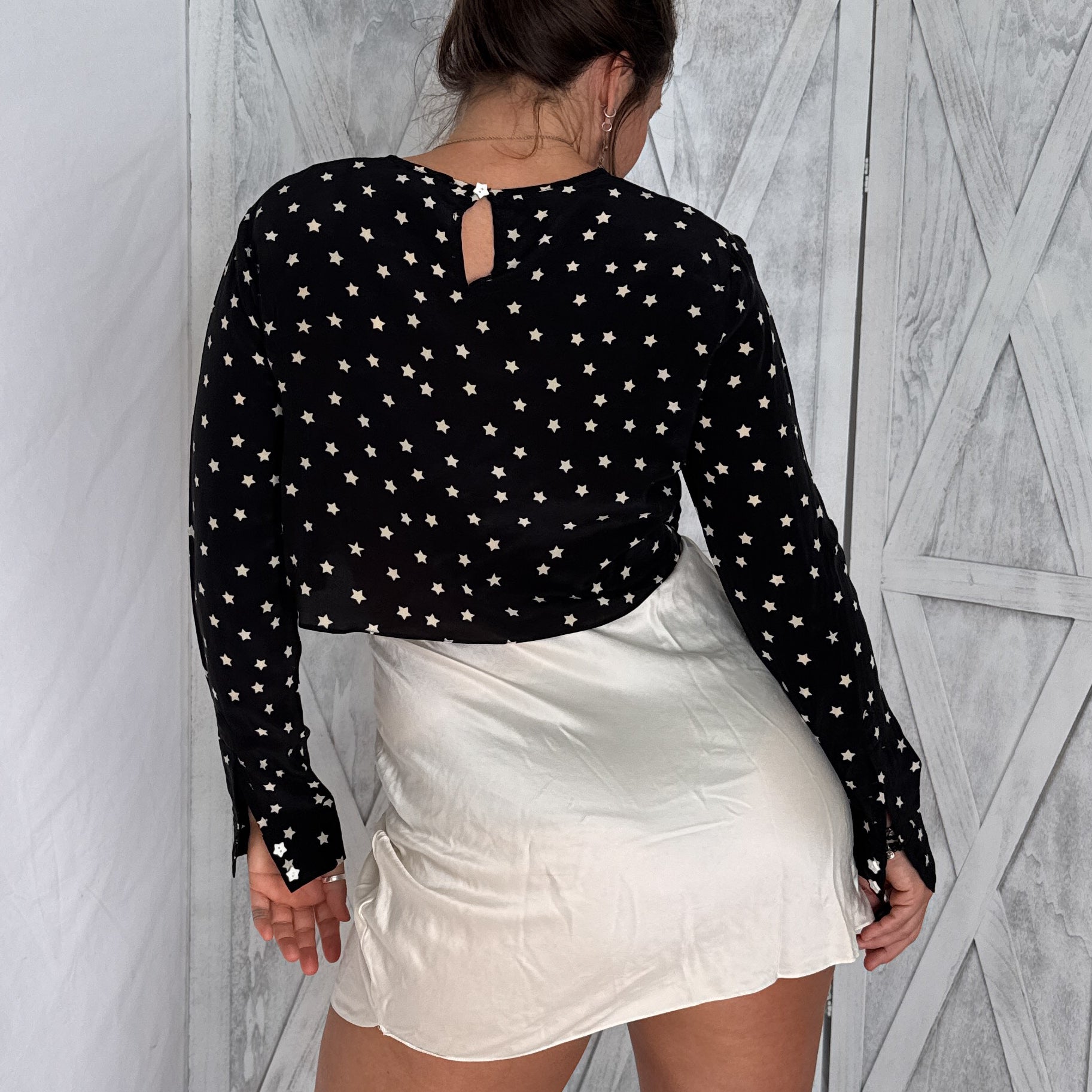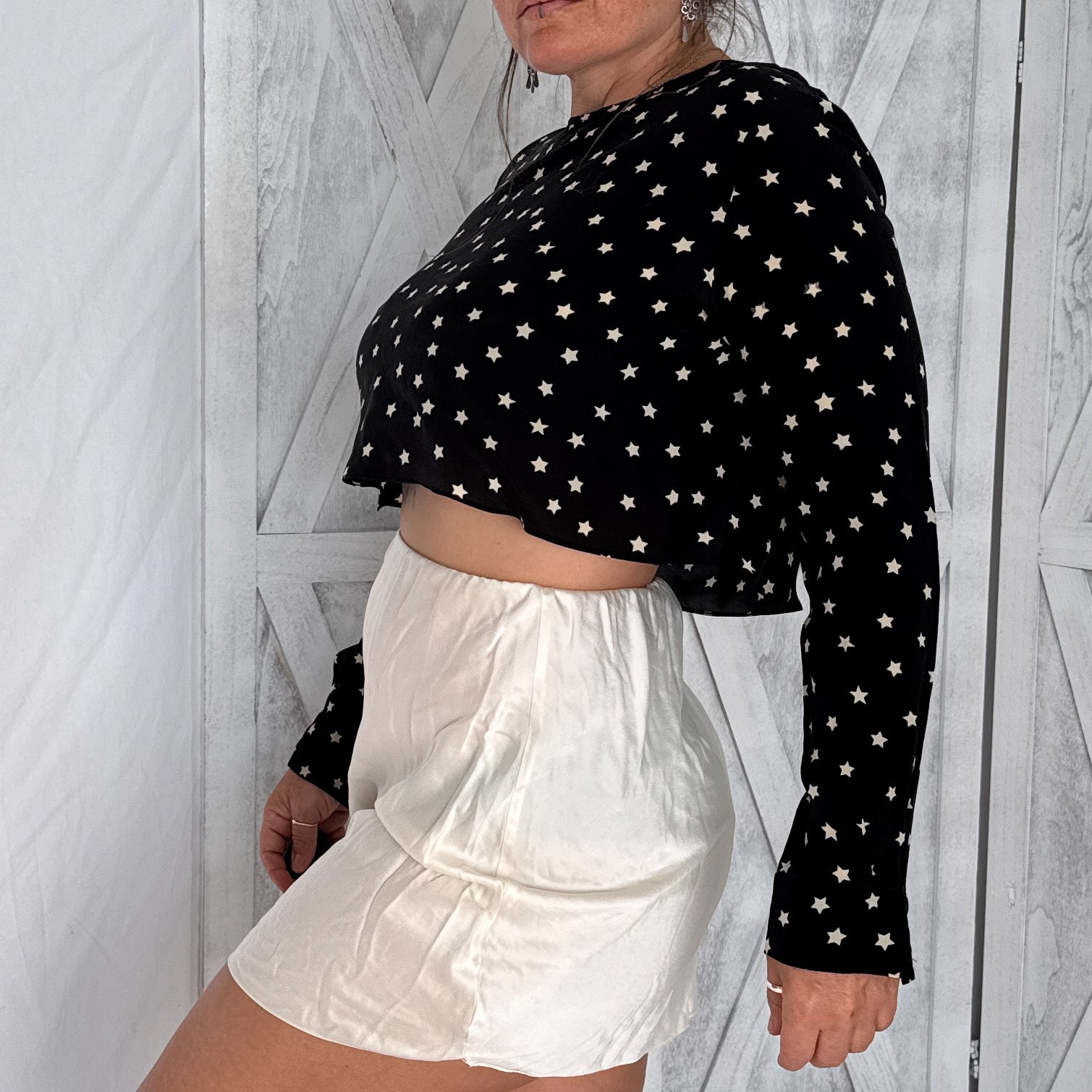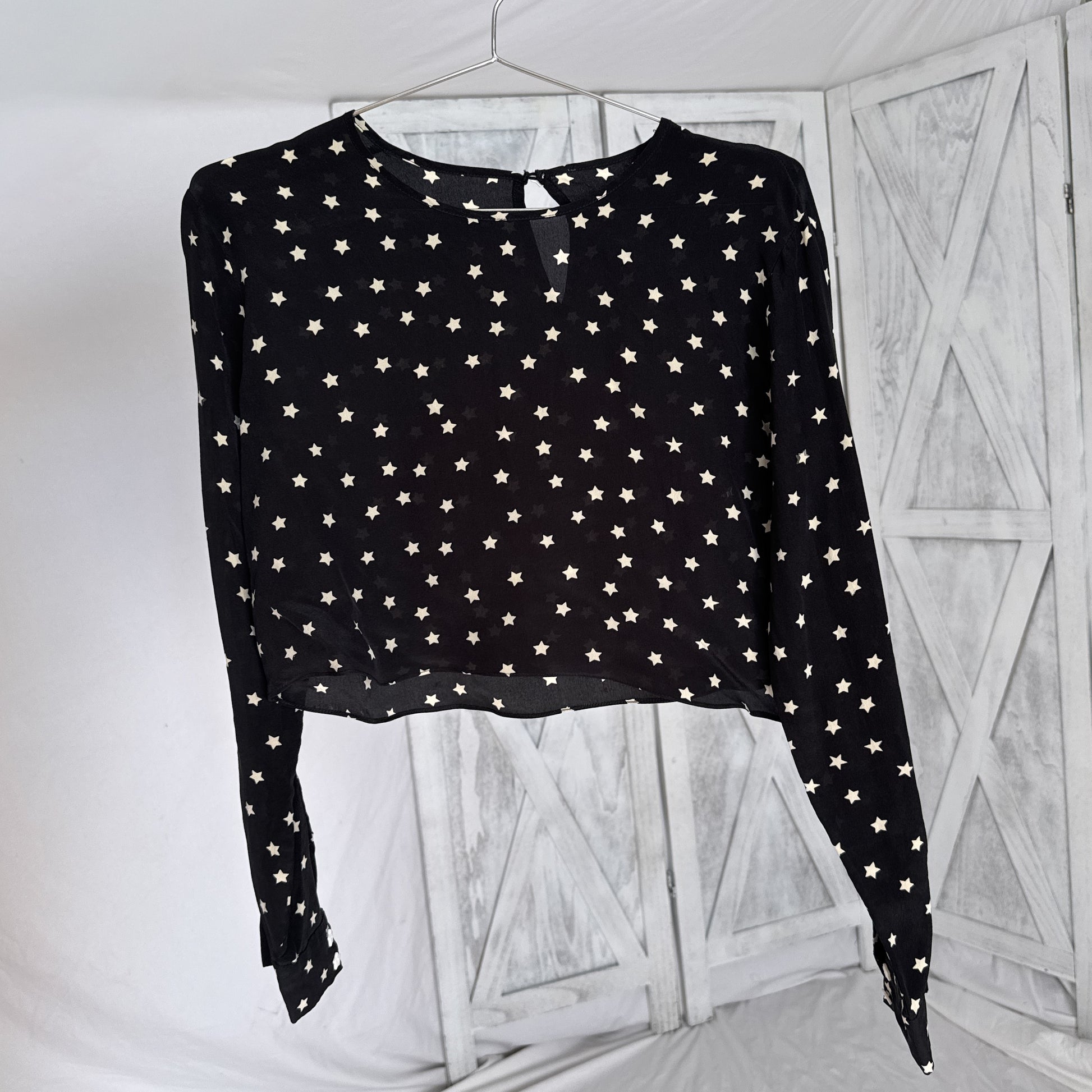 Vintage Black & White Star Print Silk Crop Top | 100% Silk Crepe | Size S