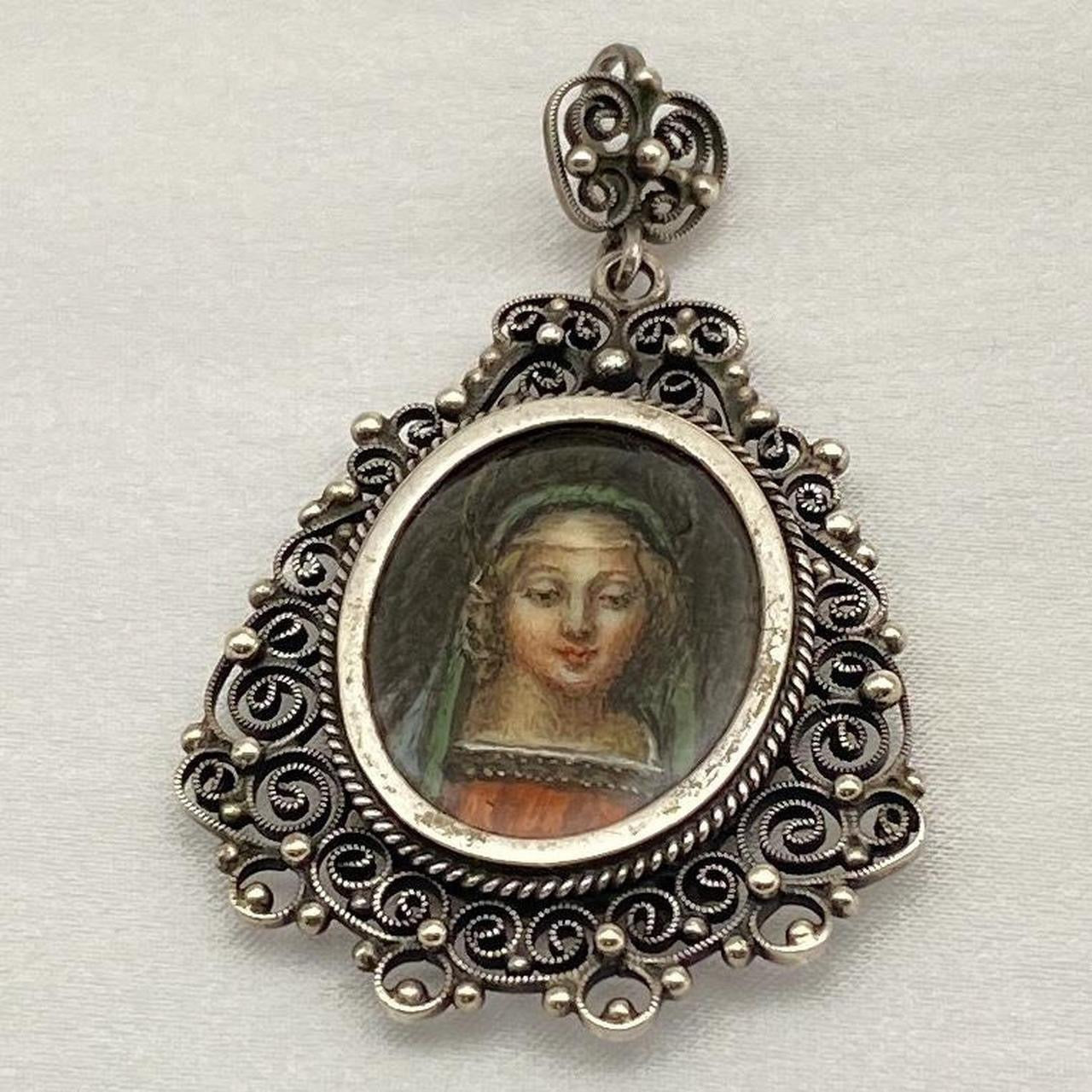 - antique, hand painted virgin mary 800 silver filigree pendant