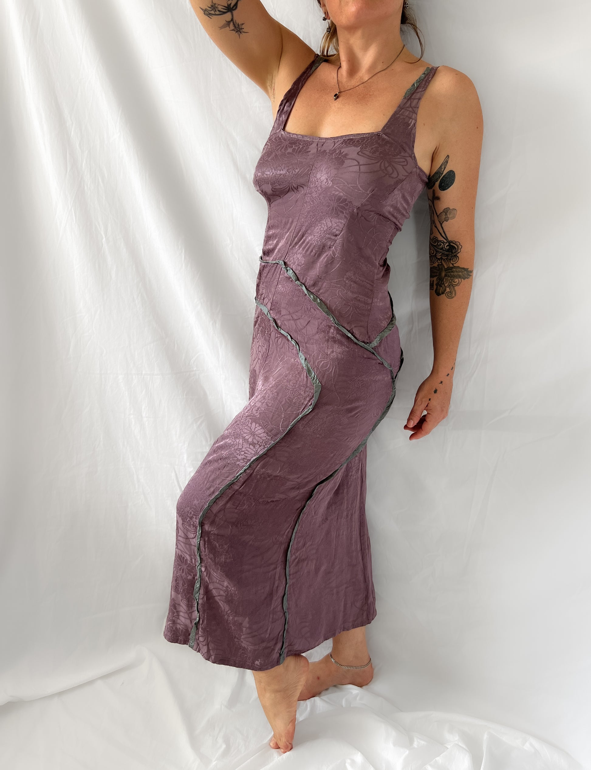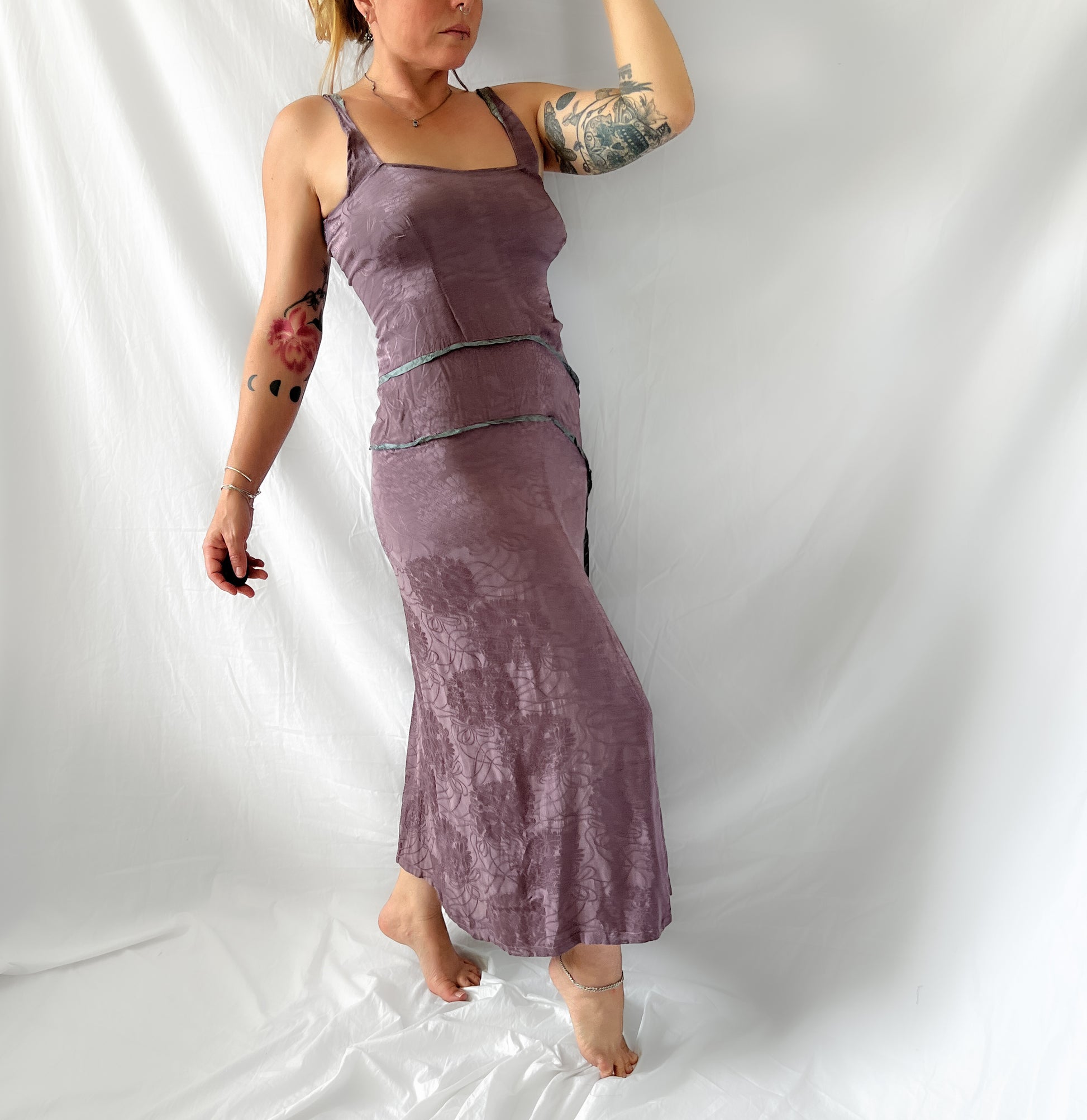 Vintage rustic floral jacquard maxi slip dress in deep lavender mauve