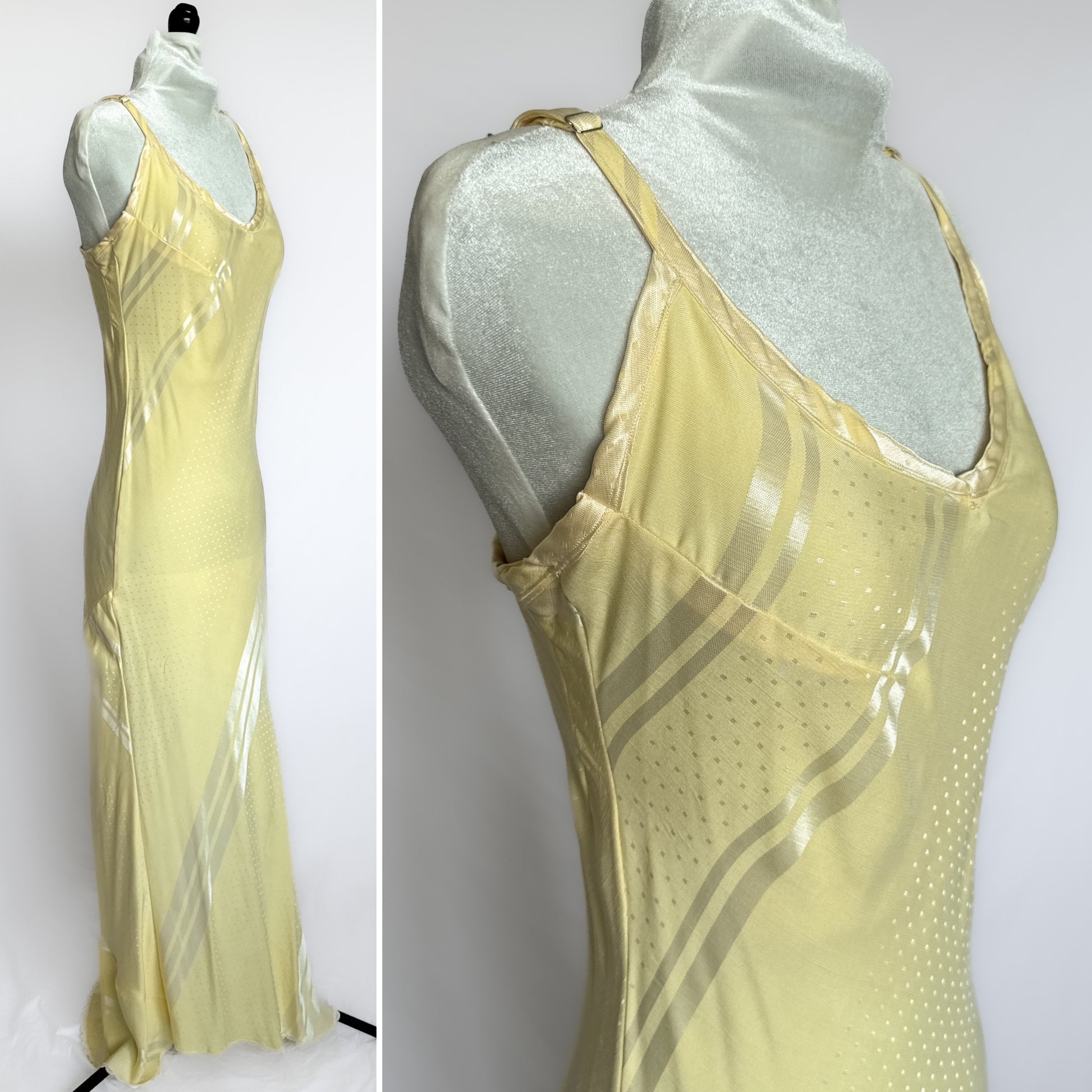 Vintage maxi slip dress in glossy yellow cream striped and dotted
